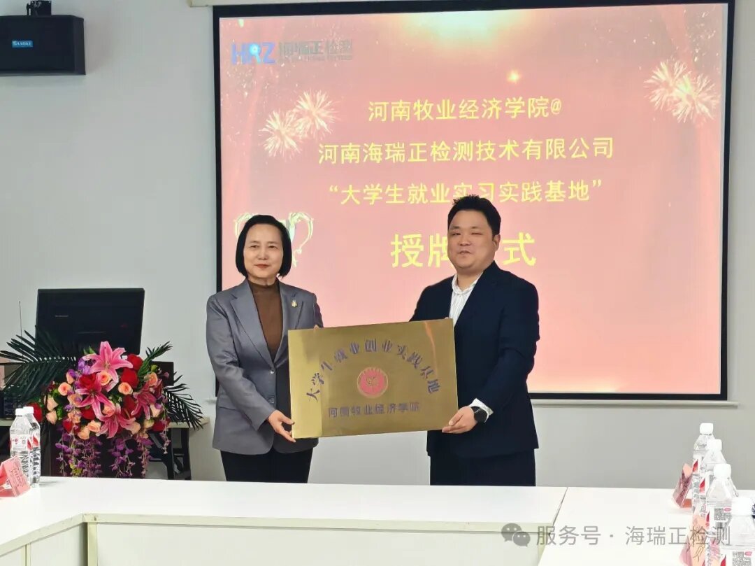 為進(jìn)一步推動合作落地,尹新明校長代表學(xué)校向海瑞正檢測授予“大學(xué)生就業(yè)實習(xí)實踐基地”和“百名專家助百企工程服務(wù)基地”牌匾。